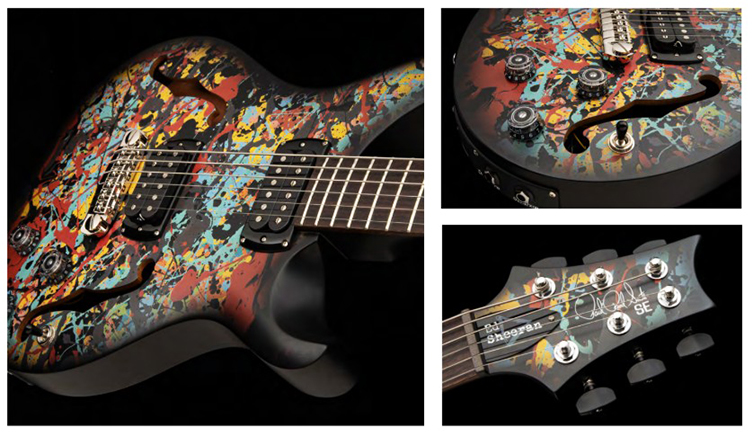 So, it’s maybe less of a surprise to learn that there’s a very limited edition PRS SE Ed Sheeran Cosmic Splash guitar on the way! Limited to 1000 guitars, this is actually pretty unusual: it’s a baritone for one thing, and it has a piezo pickup for acoustic sounds. This semi-hollow monster features Ed’s artwork on the finish and has cassette player-style Play, Stop etc symbols as fingerboard inlays.