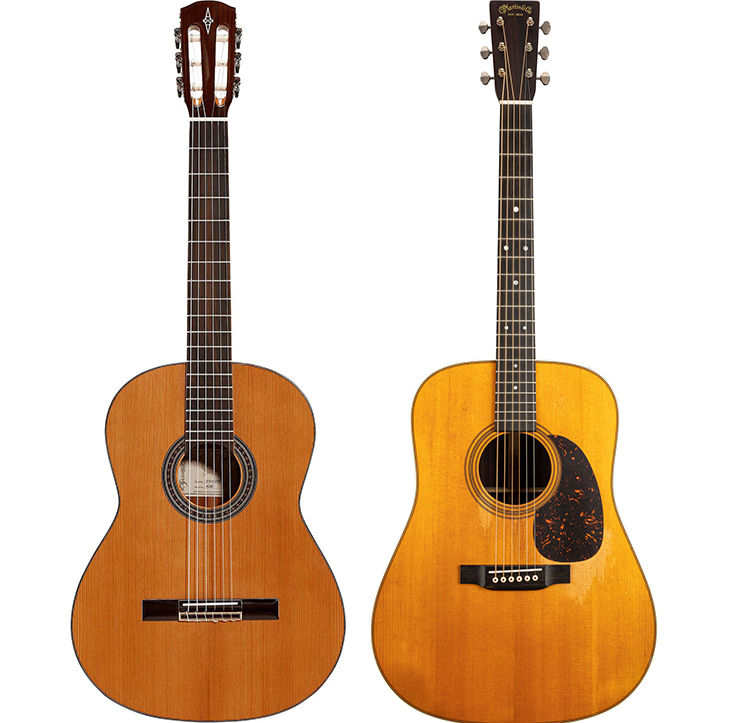 On the left is a classical guitar; and on the right is a typical steel string guitar (a Martin dreadnought)